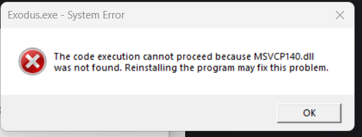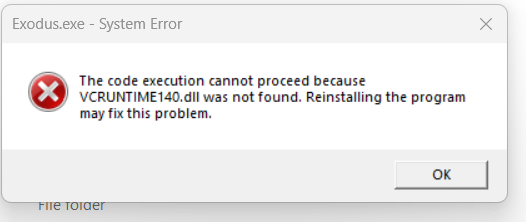 This error occurs because of missing visual c++ dll files, you can get them by following this quick installation from Microsoft: https://aka.ms/vs/17/release/vc_redist.x86.exe